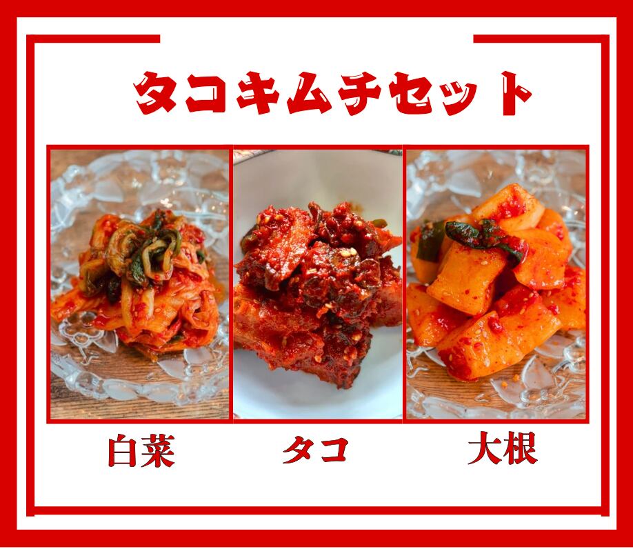 新商品のたこキムチと旬のお野菜である白菜、大根キムチのを添えてお届けします!